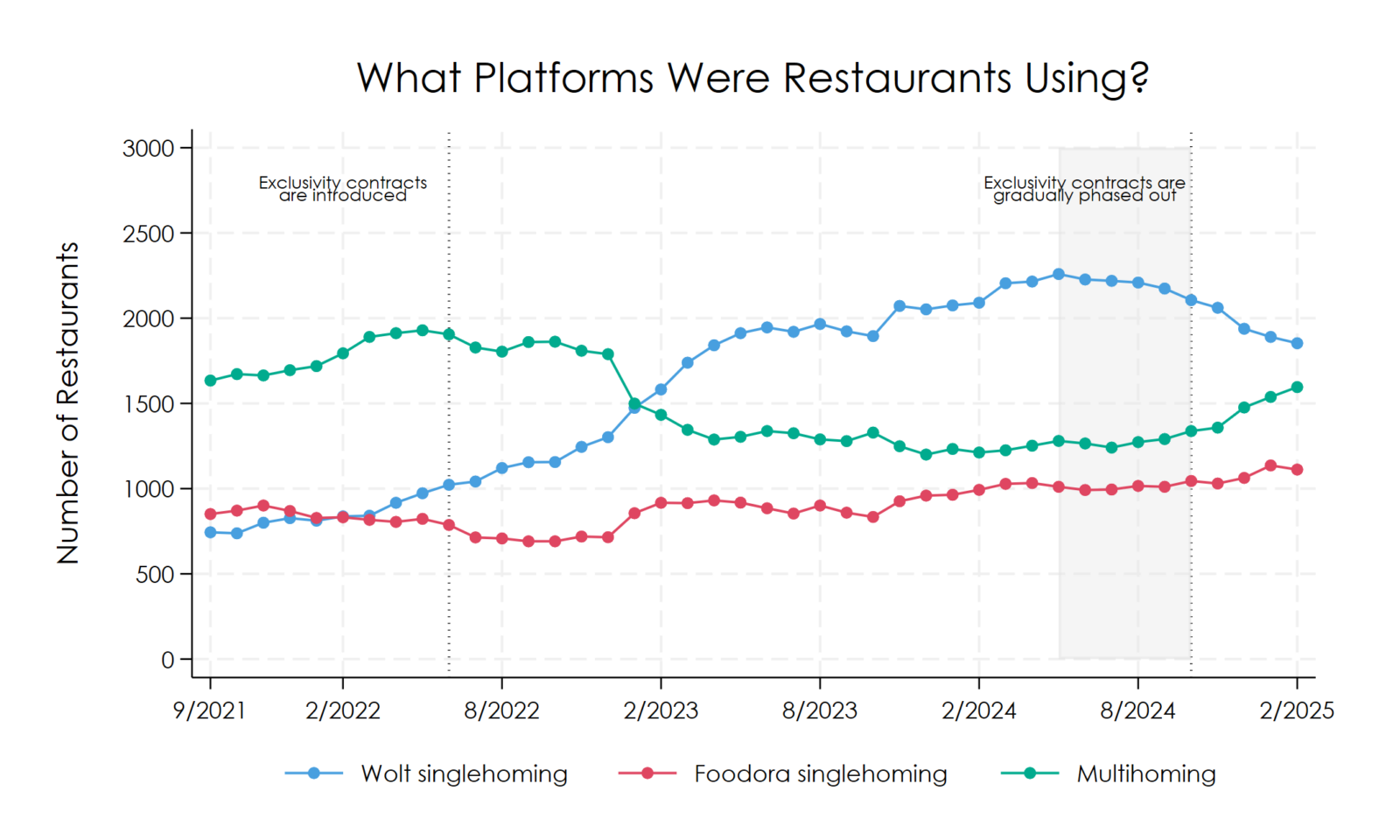 Part of this change is directly attributable to former Wolt-exclusive restaurants, which started using Foodora once their exclusivity agreements ended. However, our analysis indicates that multihoming increased and Wolt-only singlehoming declined among other restaurants as well. This may be explained by network effects typical to platform markets. Many of the exclusive restaurants were well-known restaurants and chains. When these restaurants began operating on Foodora as well, the platform became more attractive from the consumers’ perspective. The strengthening of restaurant supply and the resulting increase in the number of consumers on the platform may, in turn, have encouraged additional restaurants to start using Foodora.
