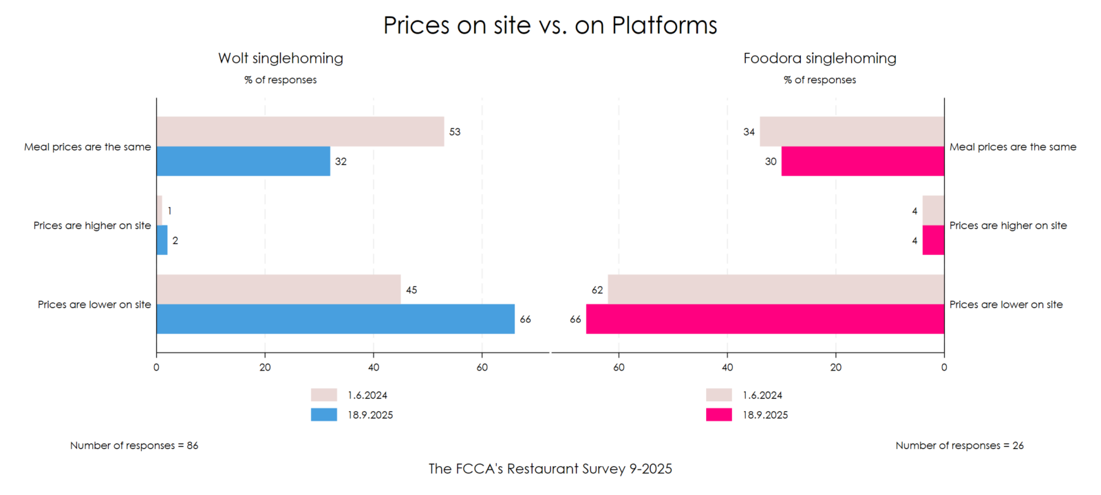The first approach was to ask restaurants for their own assessment of whether their prices in the dining room were lower, higher or the same as their prices on Wolt on 1 June 2024 (i.e. before the contractual changes) and on 18 September 2025 (i.e. after the changes). The same question was also asked with respect to Foodora, of the restaurants that operated on Foodora.