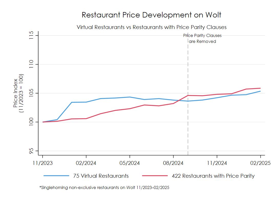 The impact of removing the parity clause on prices was also examined by comparing two groups of restaurants on Wolt. The first group consisted of virtual restaurants that sell food exclusively through platforms and were therefore never subject to the parity clause. The second group consisted of restaurants subject to the parity clause, in practice all other restaurants operating only on Wolt. Restaurants bound by exclusivity clauses were excluded from the second group to ensure that the effects of removing exclusivity were not confounded with those of removing the parity clause. The comparison was based on the assumption that, absent the removal of the parity clause, price developments at parity restaurants would have broadly mirrored those observed for virtual restaurants.