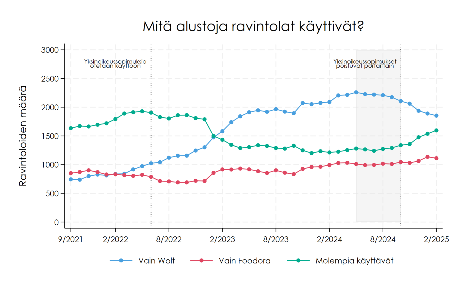Alustojen markkinaosuudet ovat luottamuksellisia, minkä vuoksi emme voi raportoida niiden tarkkaa kehitystä. KKV:n päätöksessä todetusti Wolt oli kuitenkin voittanut Foodoralta 5–10 prosenttiyksikköä markkinaosuutta yksinoikeussopimusten soveltamisen aikana. Sopimusten päättymisen jälkeen trendi on kääntynyt ja Foodoran markkinaosuus on kääntynyt hienoiseen nousuun. Nousuvauhti lokakuusta 2024 helmikuun loppuun 2025 oli kuitenkin hitaampi kuin Woltin aiempi kasvutahti.