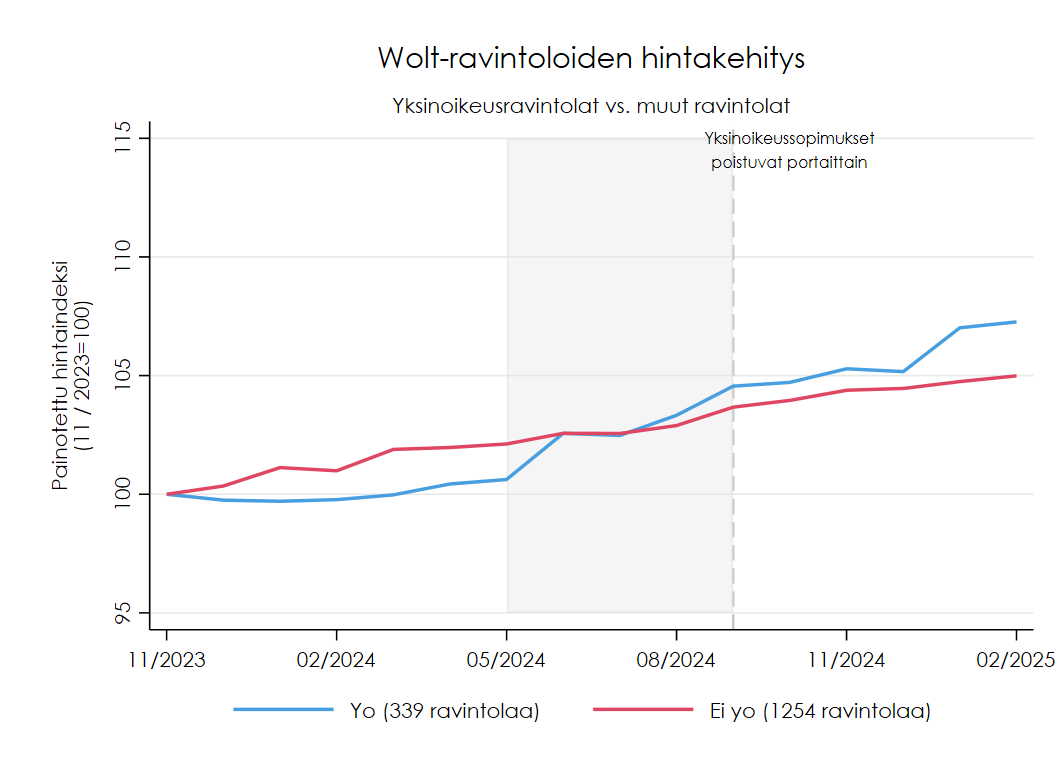 Kuvasta nähdään, että yksinoikeussopimusravintoloiden hintataso kehittyi ennen sopimusten purkamista muita ravintoloita hitaammin. Yksi syy tälle voi olla se, että alemman komissioprosentin saaneet ravintolat eivät varsinaisesti alentaneet hintojaan, vaan pidättäytyivät tavanomaisista hinnankorotuksista. Yksinoikeussopimuksista luopumisen jälkeen yksinoikeussopimusravintoloiden hinnat nousivat kuitenkin selvästi nopeammin kuin muiden ravintoloiden. Toukokuusta 2024 syyskuuhun 2024 yksinoikeusravintoloiden hinnat nousivat noin 2,4 prosenttiyksikköä enemmän kuin muiden ravintoloiden hinnat. Asteittaiset muutokset yksinoikeusravintoloiden hintaindeksissä selittyvät pääosin ketjuhinnoittelulla ja sopimusten vaiheittaisella päättymisellä. Hintojen kehitys vastaa siten edellä kuvattua hypoteesia siitä, että yksinoikeussopimusten päättymisen jälkeinen komissiotason nousu siirtyi ainakin osittain ravintoloiden hintoihin.