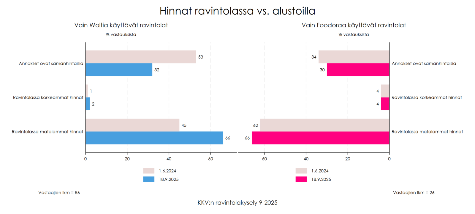 Ensimmäinen tapa oli kysyä ravintolalta sen omaa näkemystä siitä, olivatko sen hinnat ravintolasalissa olleet 1.6.2024 (eli ennen Woltin sopimusehtojen muutosta) ja toisaalta 18.9.2025 (eli sopimusmuutosten jälkeen) matalammat, korkeammat vai samansuuruiset kuin Woltissa. Sama kysymys kysyttiin myös Foodoraan liittyen, mikäli ravintola toimi myös Foodorassa.