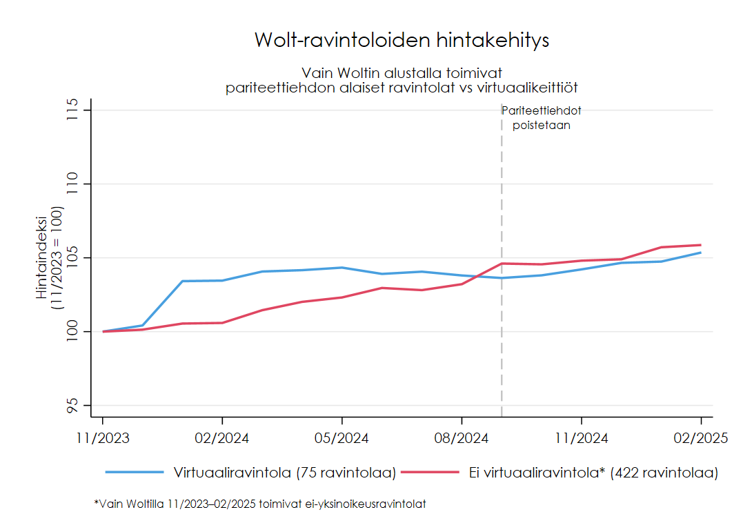 Pariteettiehdon poistamisen vaikutusta hintoihin tarkasteltiin myös vertaamalla kahta ravintolaryhmää Woltissa. Ensimmäinen ryhmä oli virtuaaliravintolat, jotka myyvät ruokaa vain alustojen kautta, ja joita pariteettiehto ei siten koskaan koskenut. Toinen ryhmä koostui pariteettiehdon alaisista ravintoloista, eli käytännössä kaikista muista vain Woltilla toimivista ravintoloista. Toisesta ryhmästä poistettiin lisäksi yksinoikeusehdon sitomat ravintolat, jotta kyseisen ehdon poistamisen vaikutus ei sekoittuisi pariteettiehdon vaikutuksiin. Vertailu perustui oletukseen, että jos pariteettiehtoa ei olisi poistettu, pariteettiravintoloiden hintakehitys olisi ollut suunnilleen samanlaista kuin virtuaaliravintoloiden.