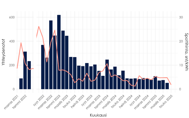 Sähköaiheisten yhteydenottojen kuukausittainen määrä ja pörssisähkön kuukauden keskihinta. Helmi-elokuun 2022 välinen katkos johtuu aineiston puuttumisesta. Lähde: Sähkön vähittäismarkkinaselvitys (Tutkimusraportteja 5/2025)