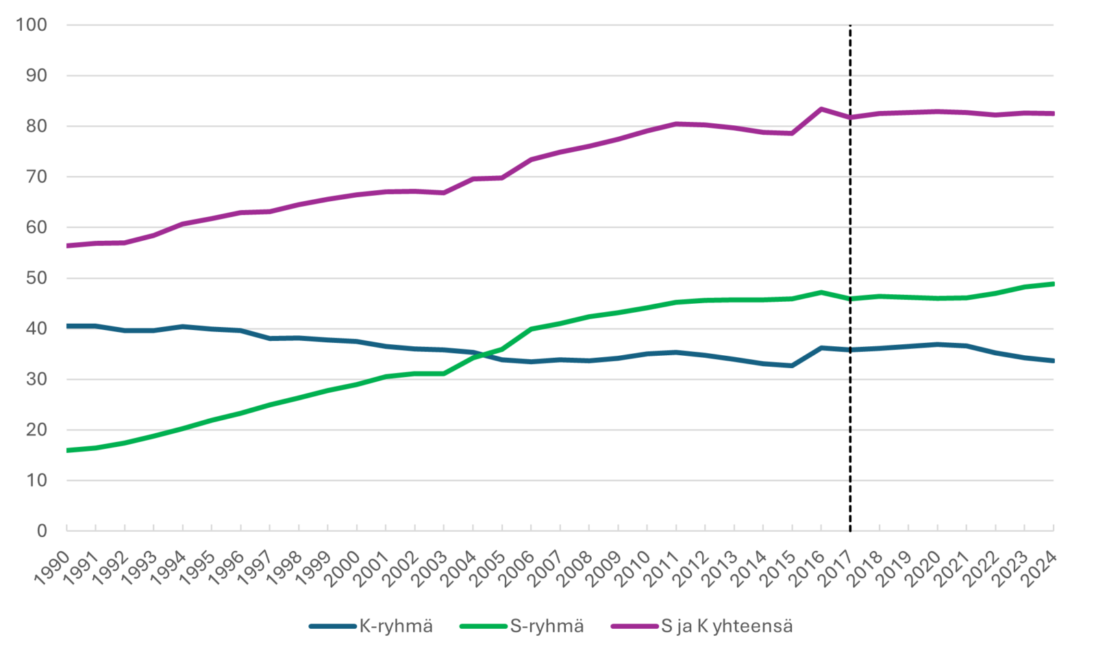 Kuva 1: S- ja K-ryhmän markkinaosuuksien kehitys vuosina 1990–2024. Lähde: PTY ja eri lähteistä kootut AC Nielsenin myymälärekisterin tiedot. Rekisteriin on vuonna 2017 liitetty suppeampaa päivittäistavaravalikoimaa myyvät halpahintamyymälät, minkä vuoksi vuoden kyseisen vuoden jälkeiset markkinaosuudet eivät ole täysin vertailukelpoisia sitä edeltävien vuosien kanssa.