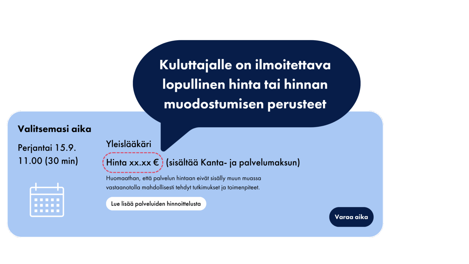 - Vaikka varausnäkymässä esitettäisiin asiantuntijan kaikki palvelut kattava hinnasto, tämä ei korvaa tarvetta kertoa kuluttajan nimenomaisesti valitseman palvelun hintaa selkeästi omana tietonaan. Hinnastot voivat olla laajoja, eikä niissä esitetyissä hinnoissa välttämättä ole huomioitu kuluttajan hintaan vaikuttavia erityispiirteitä, kuten vastaanottotyypin tai viikonlopun vaikutusta valitun vastaanottokäynnin hintaan.