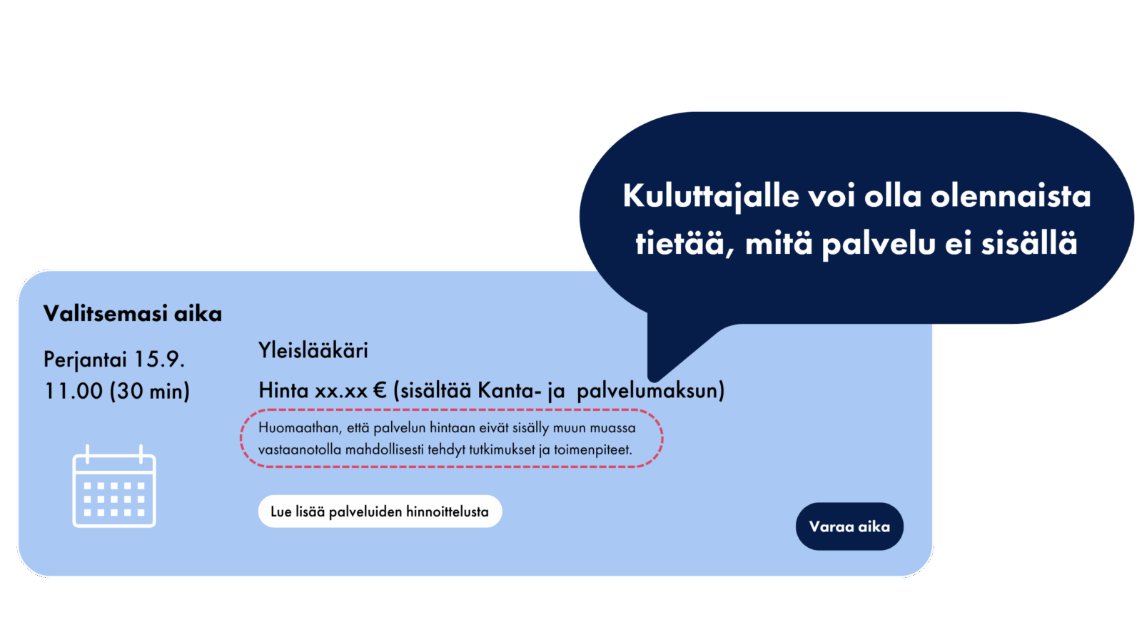 Kuluttaja saattaa esimerkiksi mieltää varaavansa vastaanottoajan saadakseen lääkärinlausunnon, jolloin kuluttajan kannalta on olennainen tieto siitä, ettei valitun palvelun hintaan sisälly lääkärilausuntoa. Näin ollen tieto erikseen veloitettavasta lääkärinlausunnosta on kuluttajan kannalta olennainen ja tieto on annettava palvelun verkkovarausnäkymässä.